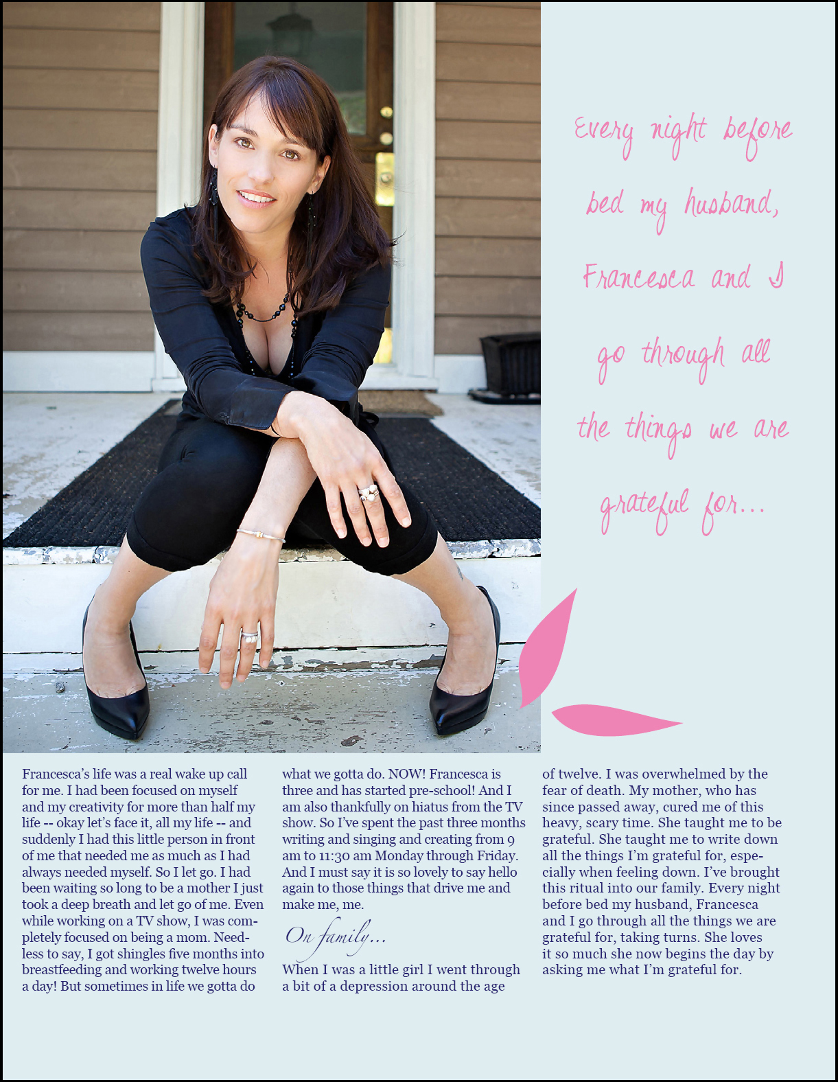 "Percebi o quanto eu preciso trabalhar para ser uma boa mãe. Eu sou o tipo de pessoa que precisa estar cumprindo comigo mesma criativamente. Estarei de folga por quatro meses, o que é ótimo, desde que eu realmente me concentre em Francesca, toque meu violão e escreva. Durante esta temporada que acabamos de filmar, eu trabalhava apenas três ou quatro dias por semana, por isso não tem sido tão difícil. Isso realmente funcionou. "