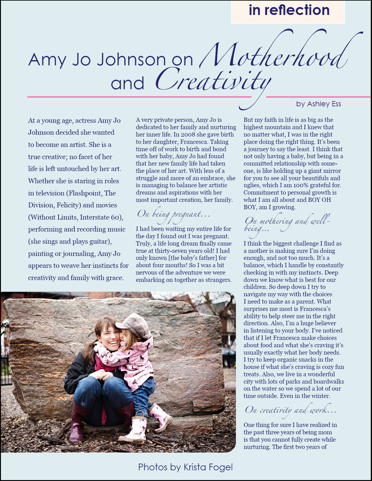Como já havíamos informado, Amy Jo Johnson está nas páginas da revista Bamboo, publicação especializada em estilos de vivência familiar. Na entrevista, Amy faz grandes revelações sobre seu período de gravidez e amamentação e fala sobre como é educar sua filha e como isso influi em seu trabalho e arte.
